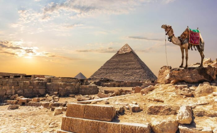 Tu guia te llevara al mejor mirador de la meseta para fotografiar las tres piramides juntas con el desierto de fondo. Aqui podras hacer un paseo opcional en camello por las dunas doradas, una experiencia autentica que pocas personas olvidan.